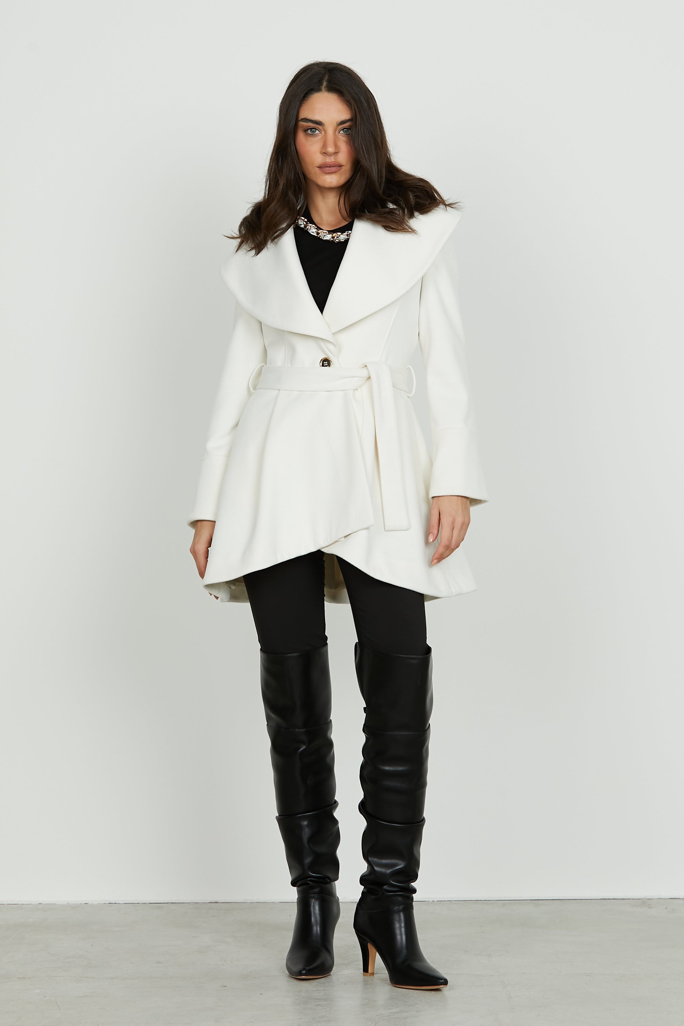 El abrigo ARUBA es el equilibrio perfecto entre comodidad y refinamiento. Su cuello chal realza delicadamente la falda, aportando un toque de fluida elegancia y ritmo. El cinturón realza la silueta con feminidad, mientras que los bolsos laterales lo hacen práctico y funcional. Una prenda de abrigo versátil, ideal para combinar con atuendos formales o informales, para afrontar el frío con estilo y personalidad.