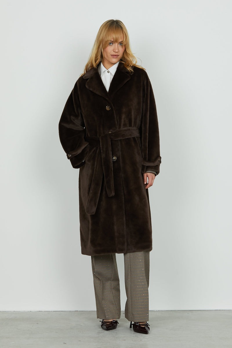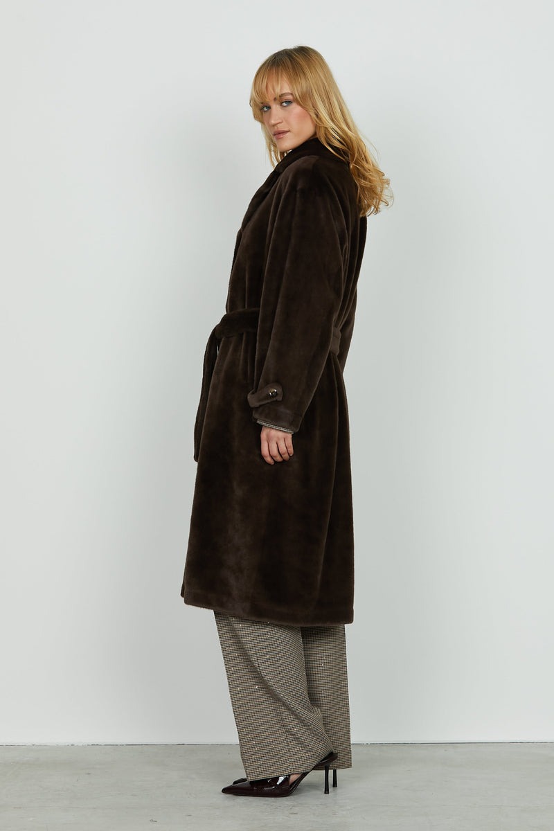 Abrigo de piel sintética CHAMLET, cálido y envolvente, con mangas RELISH Largas, elegantes solapas en los hombros y prácticos bolsillos. Se completa con un cinturón que define la silueta con estilo. Una prenda sofisticada y libre de crueldad animal, ideal para el invierno.