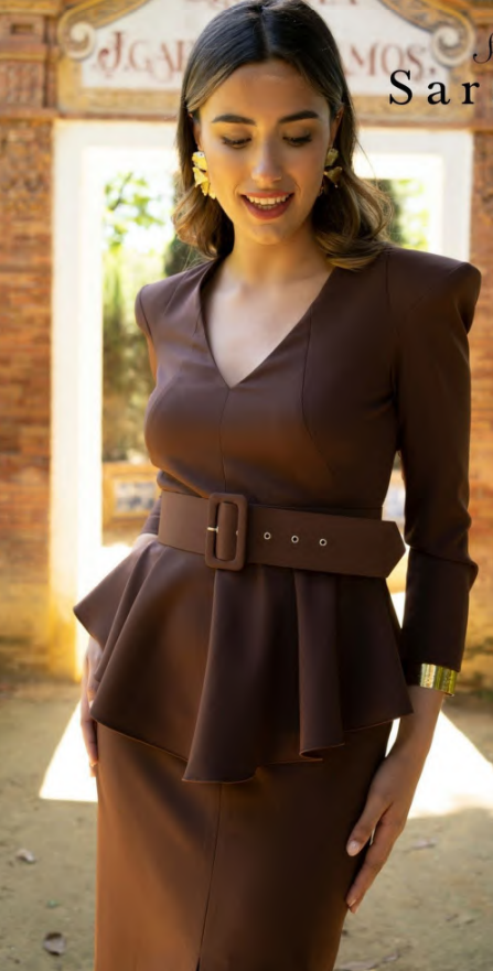 CONJUNTO DE FALDA CON ABERTURA Y CUERPO CON PEPLUM Y CINTURÓN