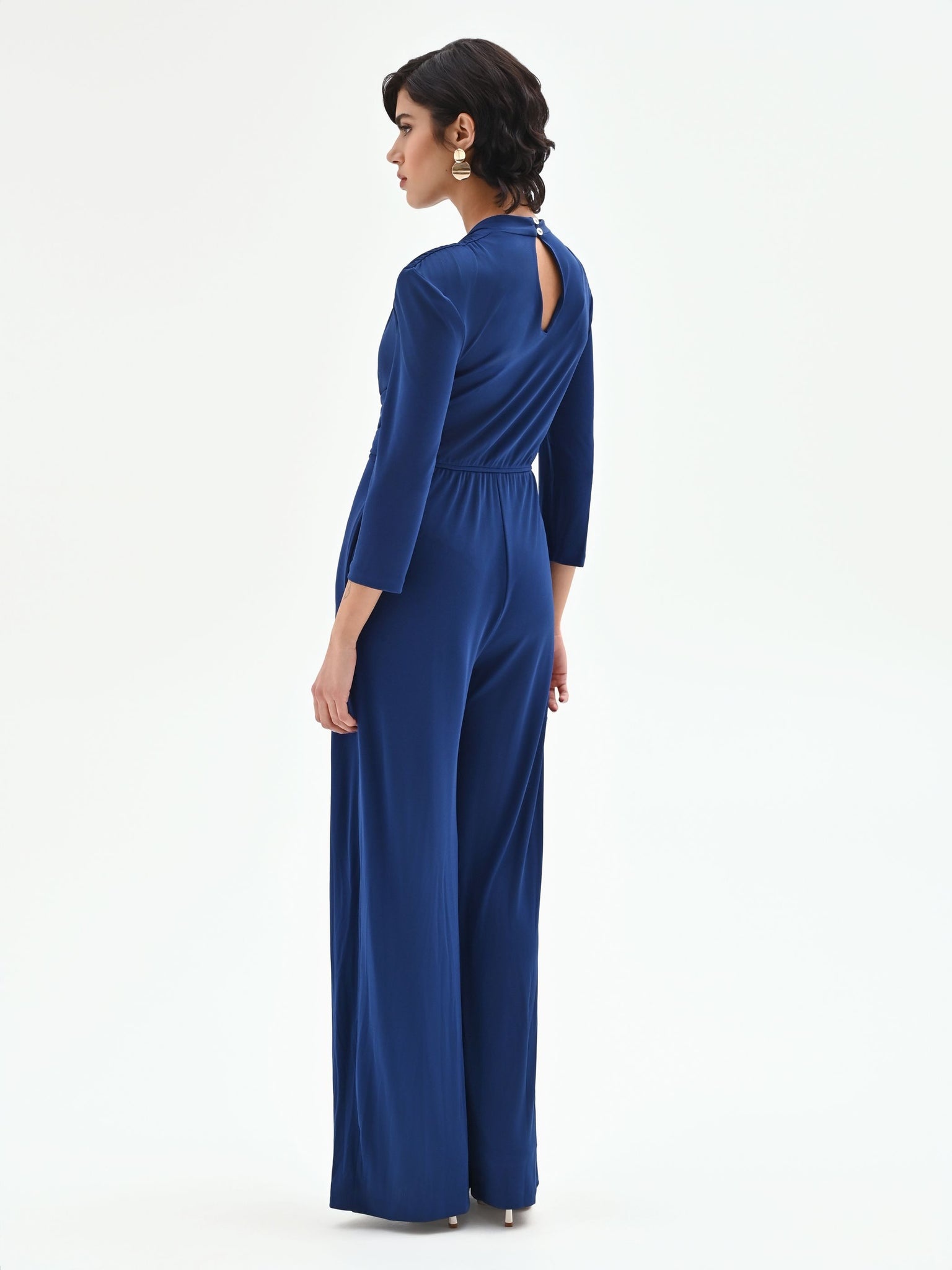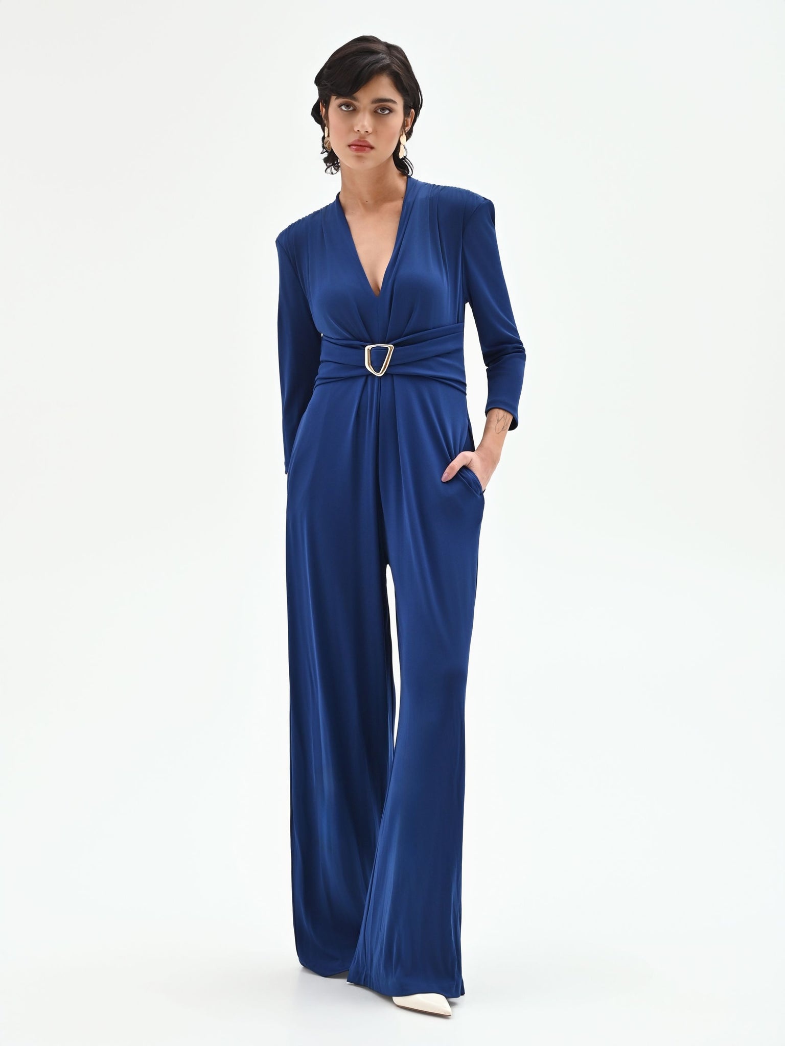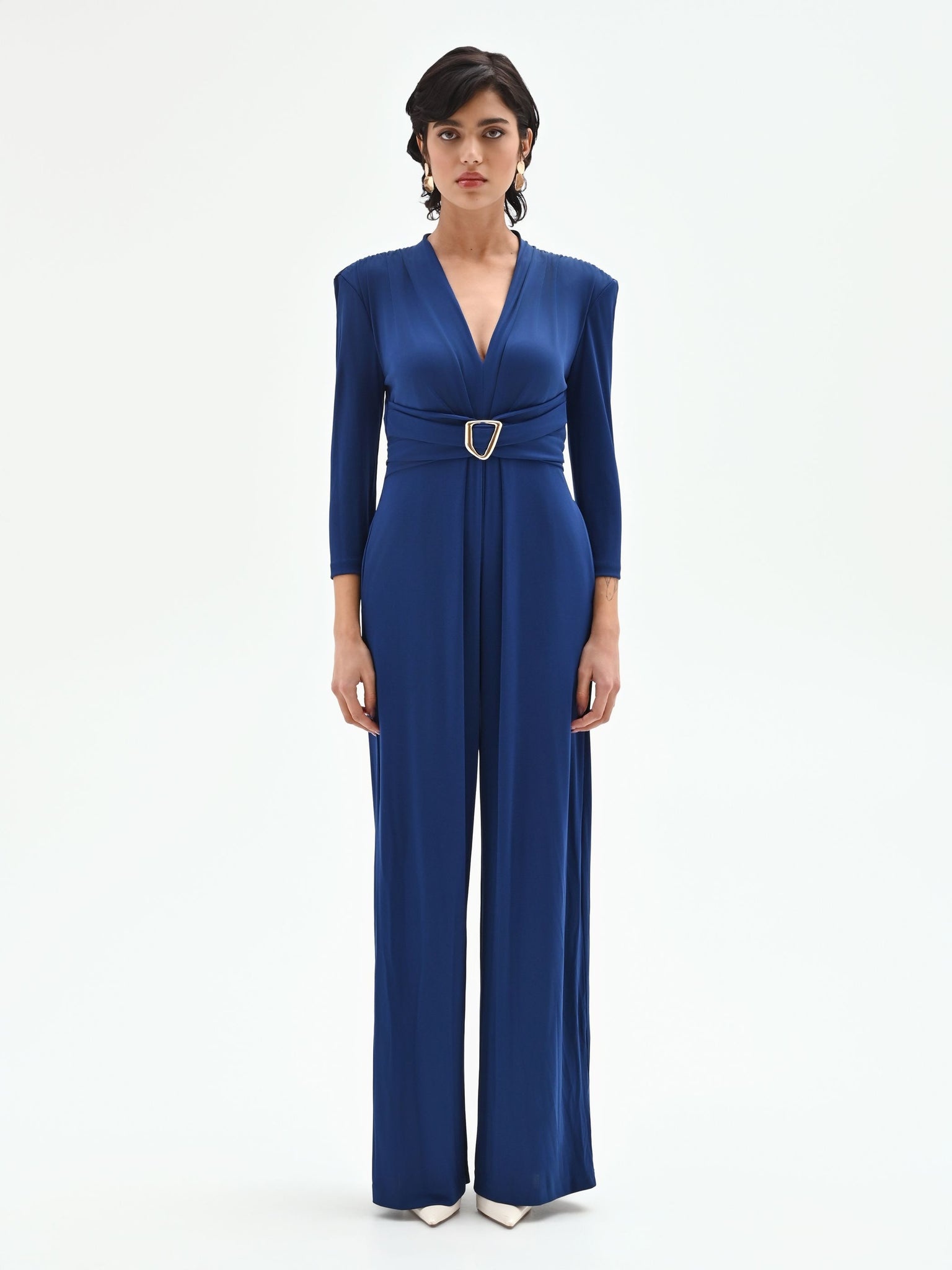 Confeccionado en punto jersey, un tejido que garantiza una caída fluida y un confort absoluto, este mono presenta un profundo escote en pico, enmarcado por mangas francesas y hombros estructurados con frunces que realzan la postura. La cintura se convierte en el centro neurálgico del diseño: una banda drapeada envuelve la silueta, sujeta por una luminosa hebilla metálica dorada de geometría irregular que embellece toda la prenda. La parte inferior se resuelve en un pantalón palazzo de pernera ancha, que acompaña cada paso con un movimiento espectacular. El cierre de cremallera en la espalda es discreto y funcional.