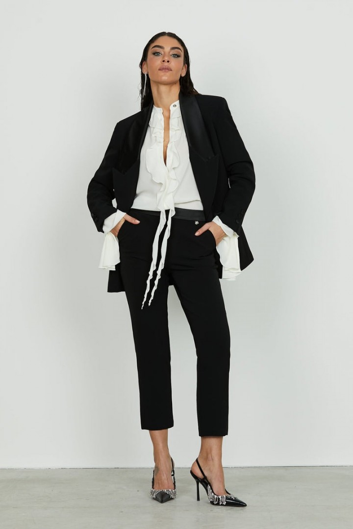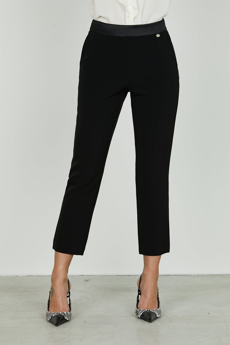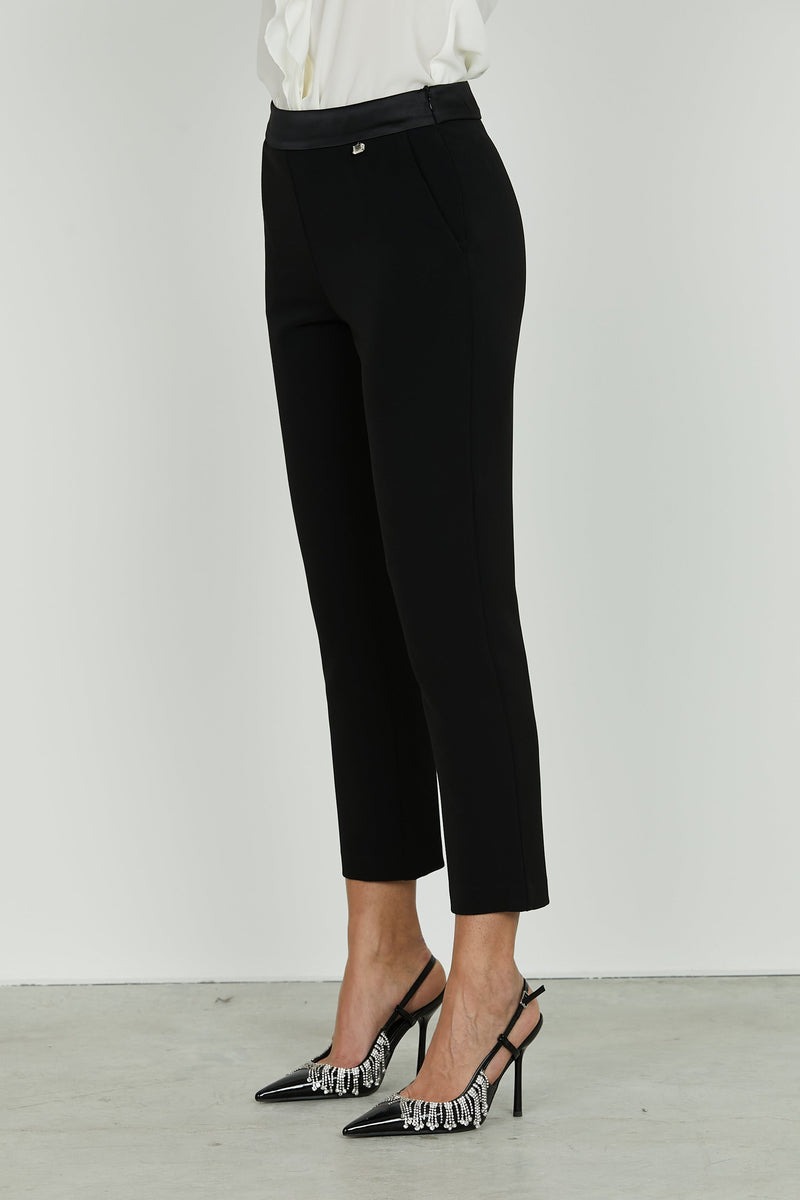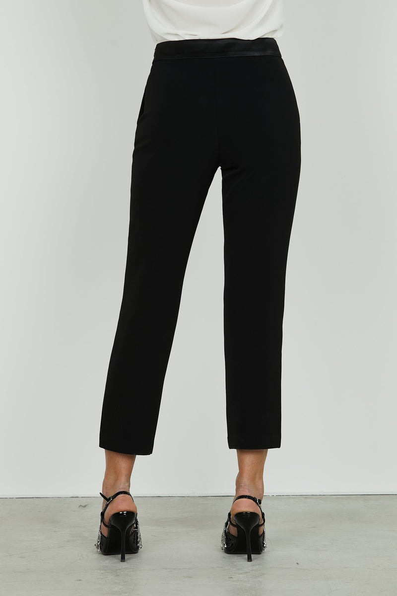 Elegante pantalón de mujer de cintura alta con peplum de satén para un acabado sofisticado. El diseño "NANTES_B" estiliza la figura, con un corte entallado que se adapta a las curvas con estilo y comodidad. El largo Capri, que llega justo por encima del tobillo, le da un toque contemporáneo, ideal para lucir el calzado.