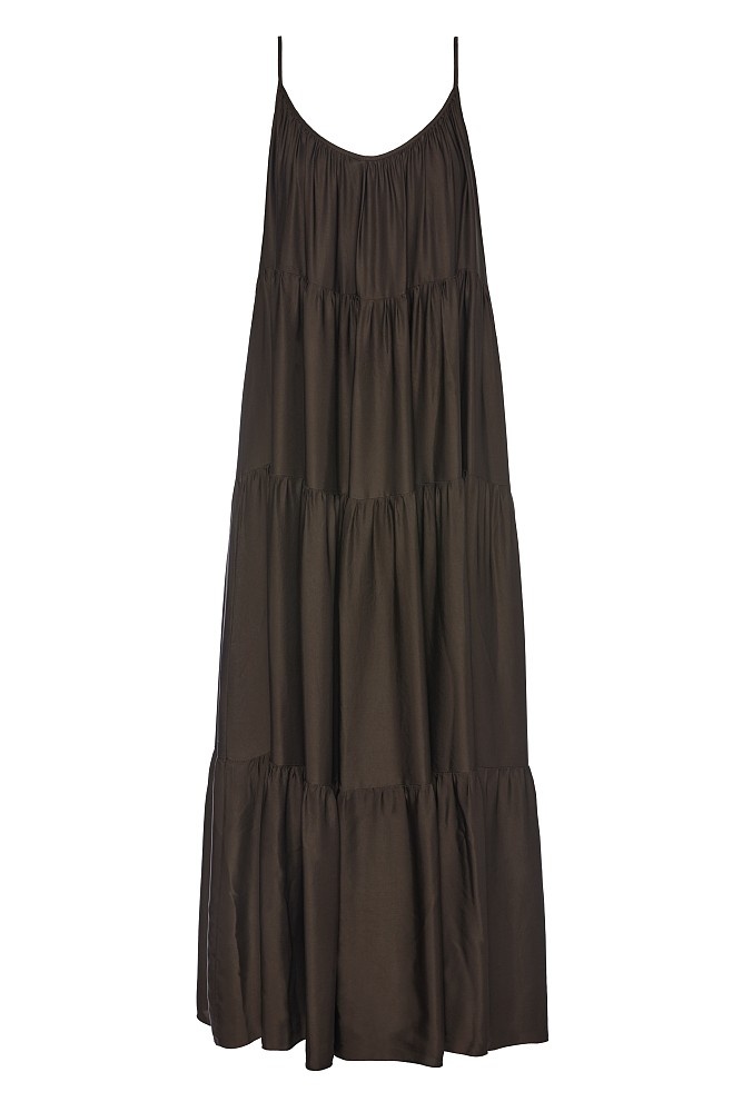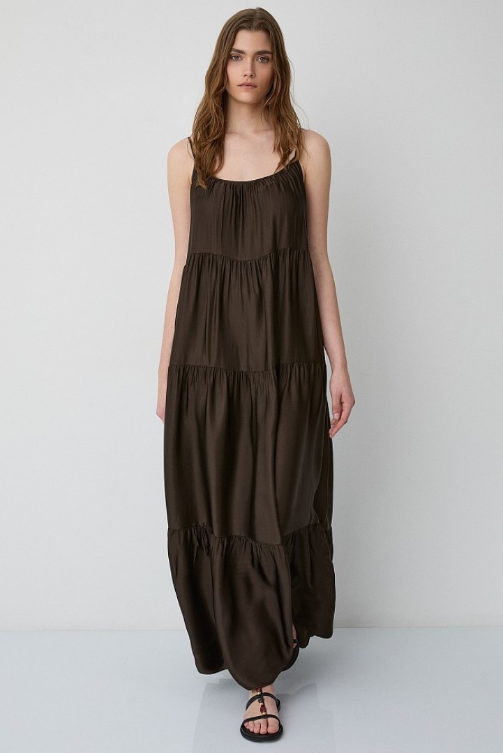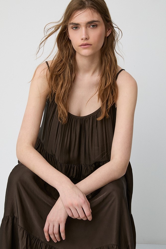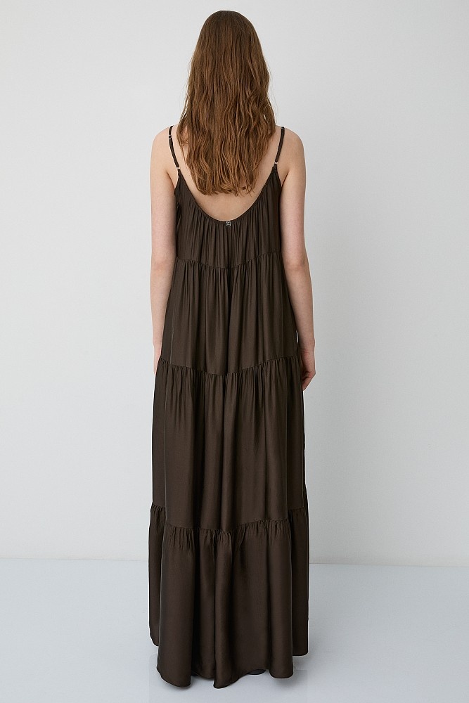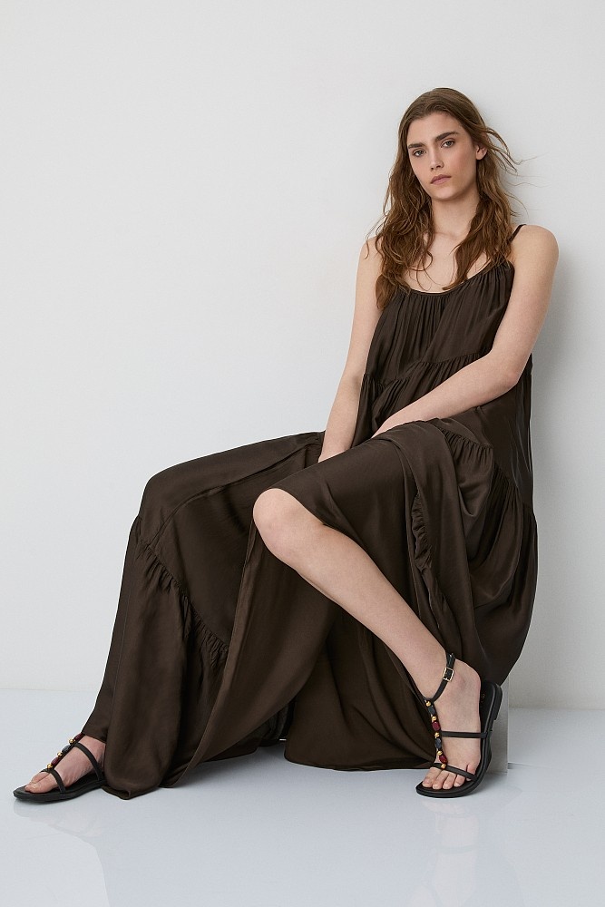 Vestido largo con aspecto satinado y volantes.DE BSB MODELO 055-211072 Vestido largo con volantes, sin mangas, tirantes ajustables, escote redondo, aspecto satinado, textura suave, corte regular.