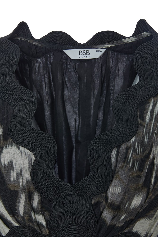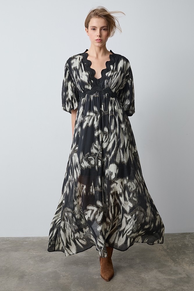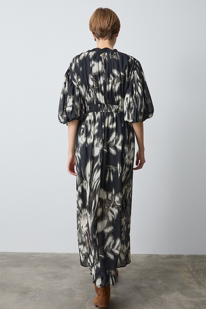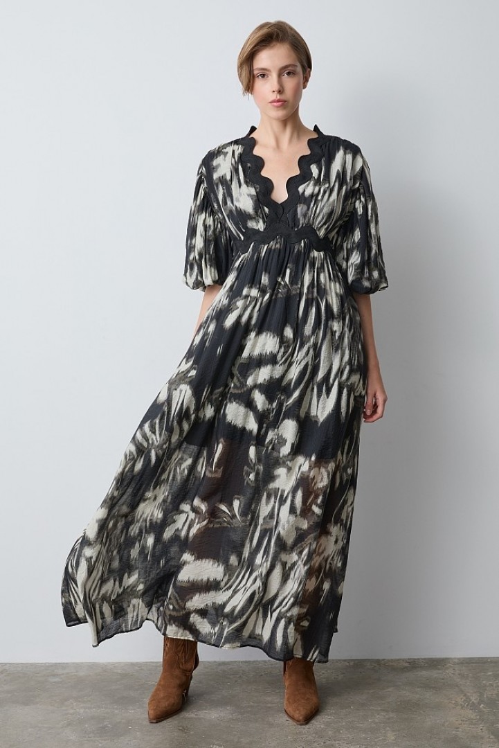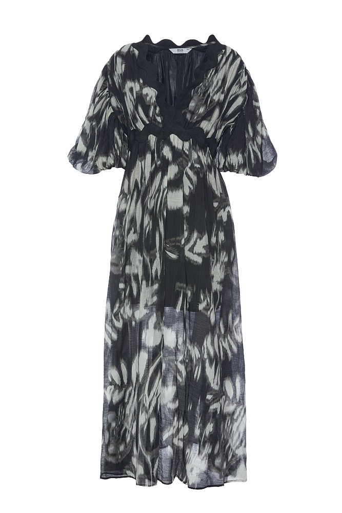 Vestido maxi estampado DE BSB MODELO 055-211019 Vestido maxi, con mangas cortas abullonadas, estampado, con escote en V, diseño recto, forro interior
